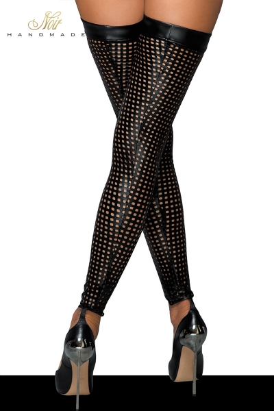 Cette paire de bas en wetlook extensible très moulant, joue le style avec ses carrés ajourés découpés au laser.