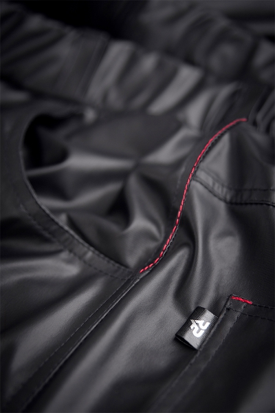 Pantalon taille basse entièrement fabriqué en tissu wetlook élastique noir par la marque Regnes Fetish Planet.