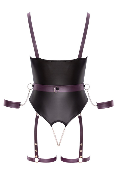 Ce body à jarretelles ouvert, signé Cottelli BONDAGE, est une véritable invitation à l'érotisme. Conçu dans un tissu noir mat et élégant, il est entièrement élastique et doux pour un confort exceptionnel. Des détails décoratifs en violet foncé noble et des accessoires argentés viennent sublimer la silhouette.